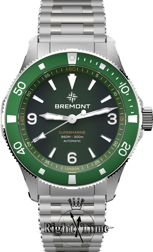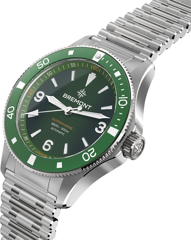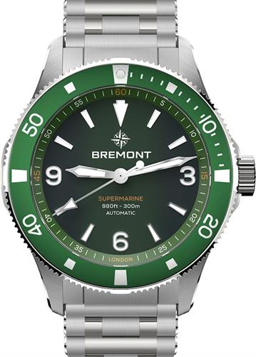 Bremont Supermarine Dive Collection. Model SM40-ND-SS-GN-B powered by automatic movement. Stainless steel case with decorated back. Green dial luminous hands and indexes. Green 0-60 rotating bezel. Sapphire crystal. Bracelet. Water resistant to 300 meters