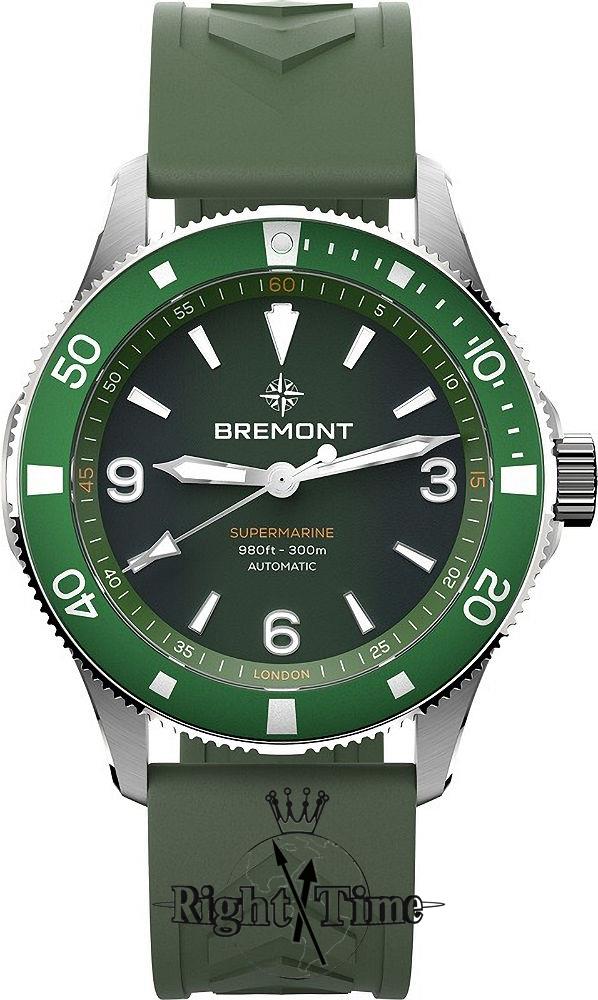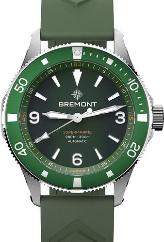 Bremont Supermarine Dive Collection. Model SM40-ND-SS-GN-R-S powered by automatic movement. Stainless steel case with decorated back. Green dial luminous hands and indexes. Green 0-60 rotating bezel. Sapphire crystal. Green rubber band. Water resistant to 300 meters