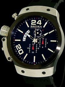Brera Orologi Estremo 48 Collection. Quartz chronograph movement with date. Black dial with seconds sub-dial at 1 o`clock, black IP plated brushed stainless steel 48mm case with unique left hand crown system. Black rubber watch band.