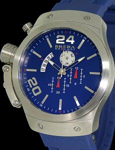 Brera Orologi Estremo 48 Collection. Quartz chronograph movement with date. Blue dial with seconds sub-dial at 1 o`clock, brushed stainless steel 48mm case with unique left hand crown system. Blue rubber watch band.