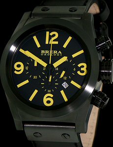Brera Orologi Eterno 45 Collection. Quartz chronograph movement with 24-hour hand. All black with bright yellow Arabic markers. Brushed stainless steel 45mm case with oversized crown. Black dial with date calendar. Black leather watch band.