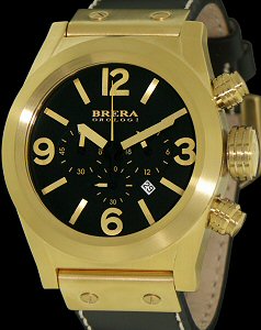 Brera Orologi Eterno 45 Collection. Quartz chronograph movement with 24-hour hand. Black dial with Arabic markers and date calendar. Yellow gold plated brushed stainless steel 45mm case with oversized crown. Black leather watch band with yellow gold plated strap guard.