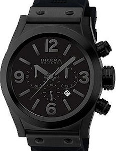 Brera Orologi Eterno 45 Collection. Quartz chronograph movement with 24-hour hand. All black brushed stainless steel 45mm case with oversized crown. Black dial with date calendar and black hands and markers. Black rubber strap