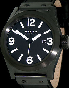 Brera Orologi Eterno 45 Solo Tempo Collection. Quartz movement. Black IP plated brushed stainless steel 45mm case with oversized crown. Black dial with date calendar and contrasting white Arabic markers. Black leather watch band with black plated strap guard.