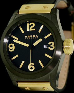 Brera Orologi Eterno 45 Solo Tempo Collection. Quartz movement. Black IP plated brushed stainless steel 45mm case with oversized crown. Black dial with date calendar and contrasting yellow Arabic markers. Black leather watch band with yellow gold plated strap guard.