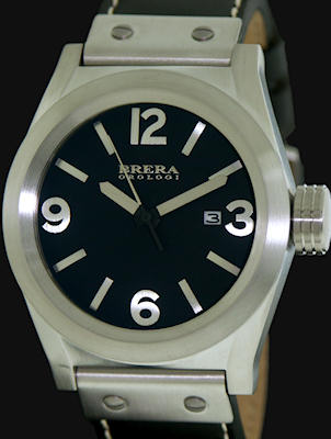 Brera Orologi Eterno 45 Solo Tempo Collection. Quartz movement. Brushed stainless steel 45mm case with oversized crown. Black dial with date calendar. Black leather watchband with steel strap guard.