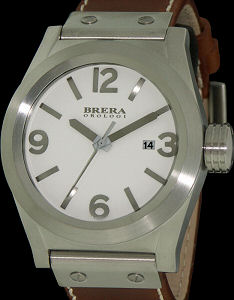 Brera Orologi Eterno 45 Solo Tempo Collection. Quartz movement. Brushed stainless steel 45mm case with oversized crown. White dial with date calendar. Brown leather watch band with strap guard.