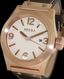 Brera Orologi Eterno 45 Solo Tempo Collection. Quartz movement. Rose gold IP plated brushed stainless steel 45mm case with oversized crown. Cream color dial with date calendar. Brown leather watch band.