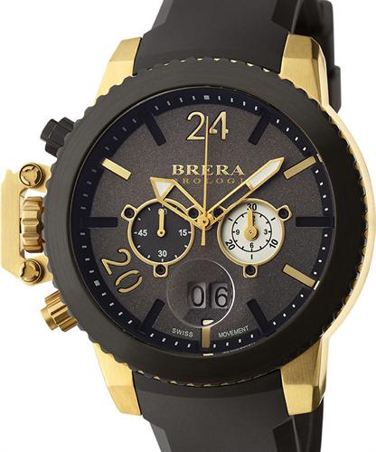 Brera Orologi Militare Collection model BRML2C4802. Left handed. Quartz chronograph movement with 24-hour hand. 48 mm stainless steel black and yellow gold plated case. Unique crown lock system at 9 o`clock. Black dial with large date window at 6 o`clock. Rubber watch band.