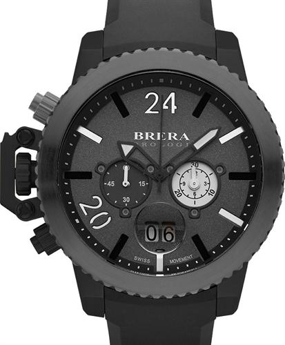 Brera Orologi Militare Collection model BRML2C4805. Left handed. Quartz chronograph movement with 24-hour hand. 48 mm black ip plated stainless steel case. Unique crown lock system at 9 o`clock. Black dial with large date window at 6 o`clock. Black rubber watch band.
