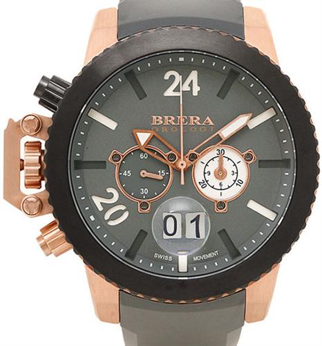 Brera Orologi Militare Collection model BRML2C4808. Left handed. Quartz chronograph movement with 24-hour hand. 48 mm stainless steel rose gold plated case. Grey bezel. Unique crown lock system at 9 o`clock. Grey dial with large date window at 6 o`clock. Grey rubber watch band.