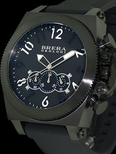 Brera Orologi Militare 50 Collection. Quartz chronograph movement with 24-hour hand. All black with even white Arabic numerals. Brushed stainless steel extra large 50mm case with unique crown lock system. Rubber watch band.