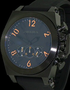 Brera Orologi Militare 50 Collection. Quartz chronograph movement with 24-hour hand. All black with even orange Arabic numerals. Brushed stainless steel extra large 50mm case with unique crown lock system. Rubber watch band.