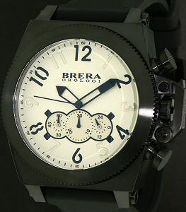 Brera Orologi Militare 50 Collection. Quartz chronograph movement with 24-hour hand. Black IP plated brushed stainless steel extra large 50mm case with unique crown lock system. Ivory dial with black/ivory Arabic numerals. Black rubber watch band.