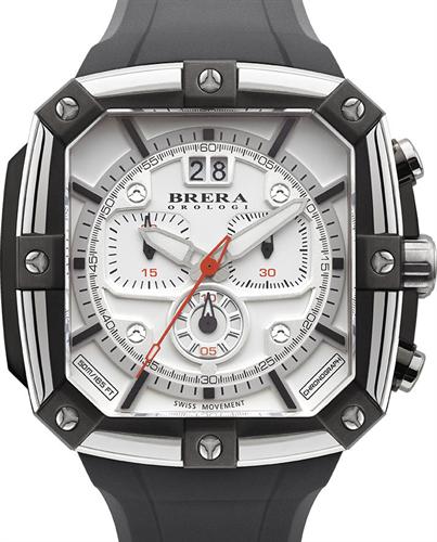 SuperSportivo Square collection presenting quartz Chronograph in 44mm x 46mm stainless steel case with white multi-layer dial, multi-faceted sapphire crystal (16 unique cuts) and black silicone rubber strap.