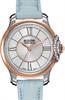 AccuSwiss ladies size watch 65R158 from AccuSwiss Bellecombe Collection. Stainless steel rose gold plated case with diamonds around cabochon crown. Swiss quartz movement. Silver color dial with Roman numerals. Sapphire crystal. Light blue leather watch strap.