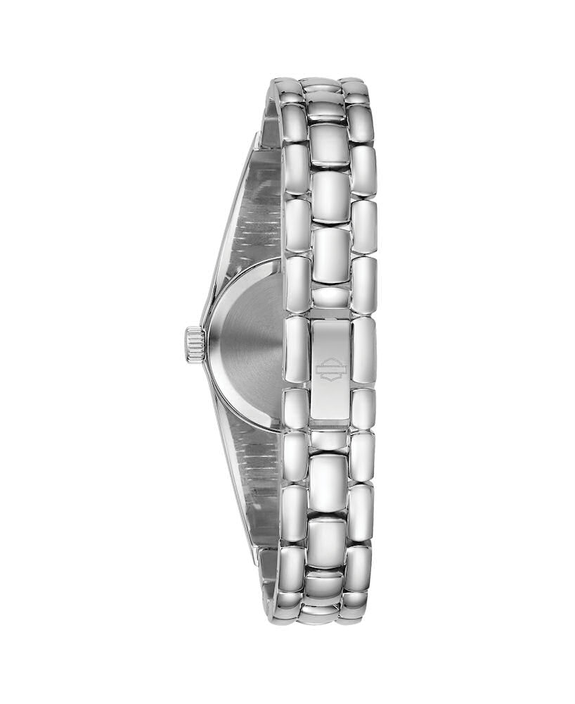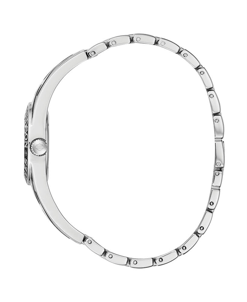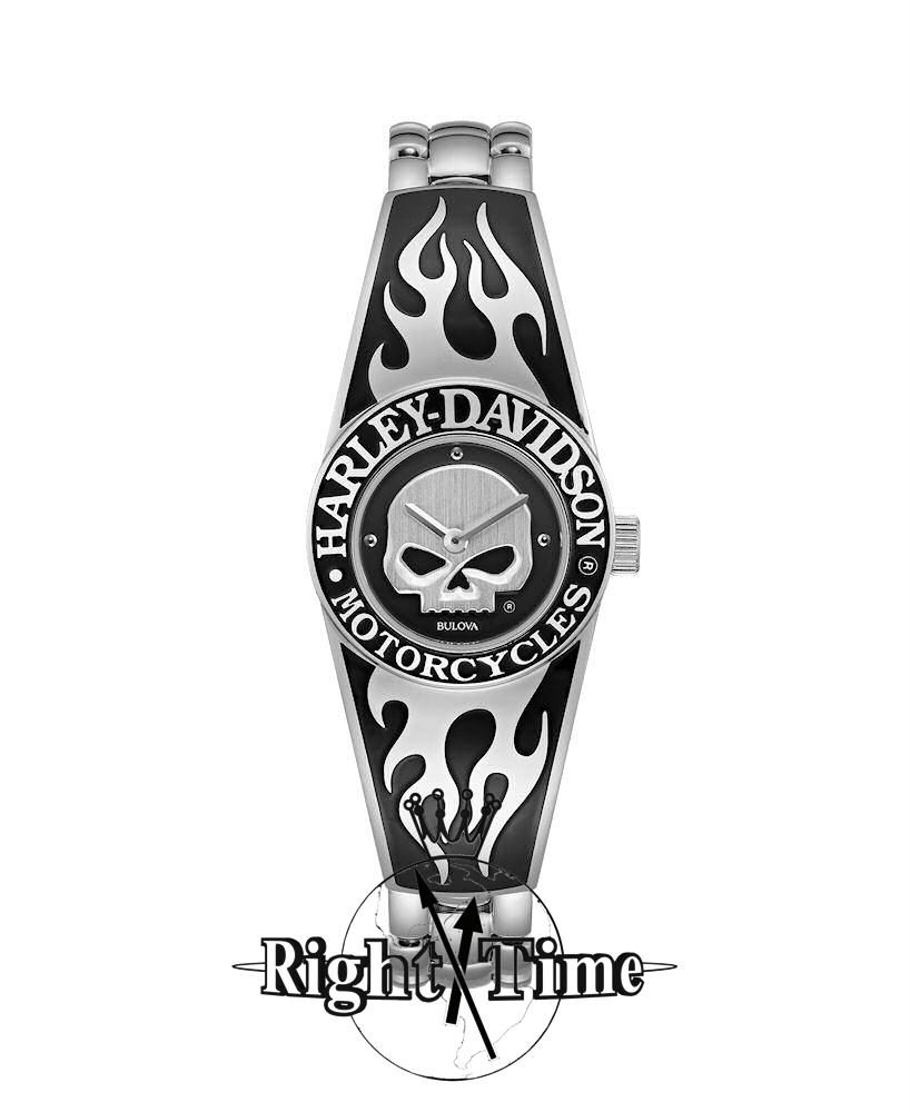 Bulova Harley-Davidson Ladies Watch model 76L190. Quartz movement. Stainless steel case. Semi-bangle with adjustable links and highlighting flame design. Black dial with embossed skull design.