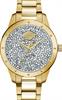 Bulova Harley-Davidson Ladies Watch model 77L110. Quartz movement. Yellow gold plated stainless steel case with bracelet. Black sparkly dial with ultra-fine rocks made from Swarovski crystals. Bar-shield logo at 12-o`clock. Second hand with signature H-D counterweight.