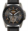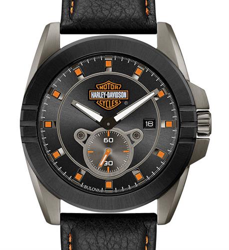 Bulova Harley-Davidson Men`s Watch model 78B182. Quartz movement. Grey plated stainless steel case with black leather band. Black dial with Harley-Davidson logo and seconds sub-dial inspired by the throttle mounting hardware.