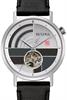 Bulova Oculus automatic watch. An abstract depiction of Frank Lloyd Wright`s "December Gifts". Feature stainless steel case, grey textured dial with "heartbeat" open aperture, and observation case back. Comes on black leather band.
