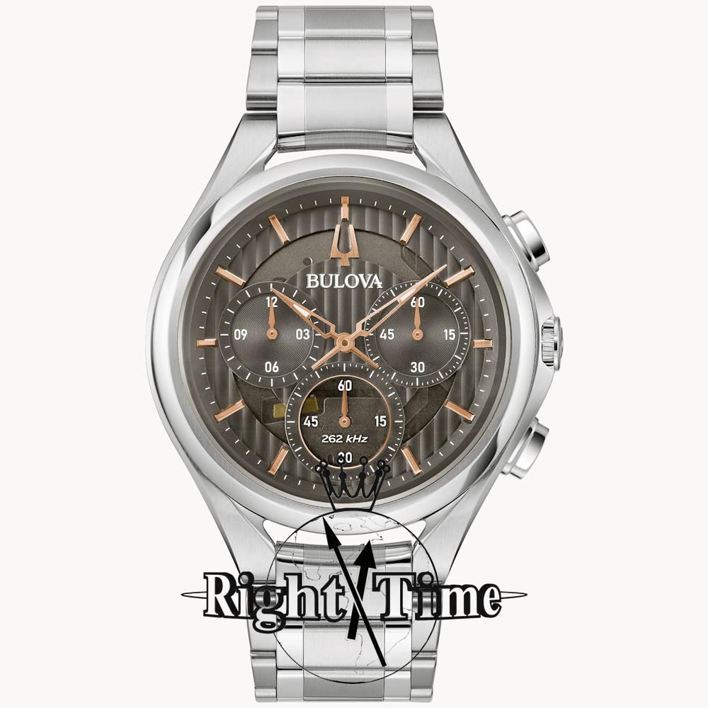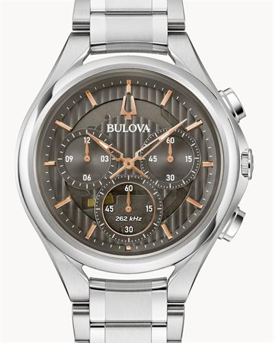 Bulova Men`s Curv chronograph watch. Model 96A298. High Performance Quartz Curv Chronograph movement. Stainless steel case with bracelet. Curved sapphire crystal. Grey dial