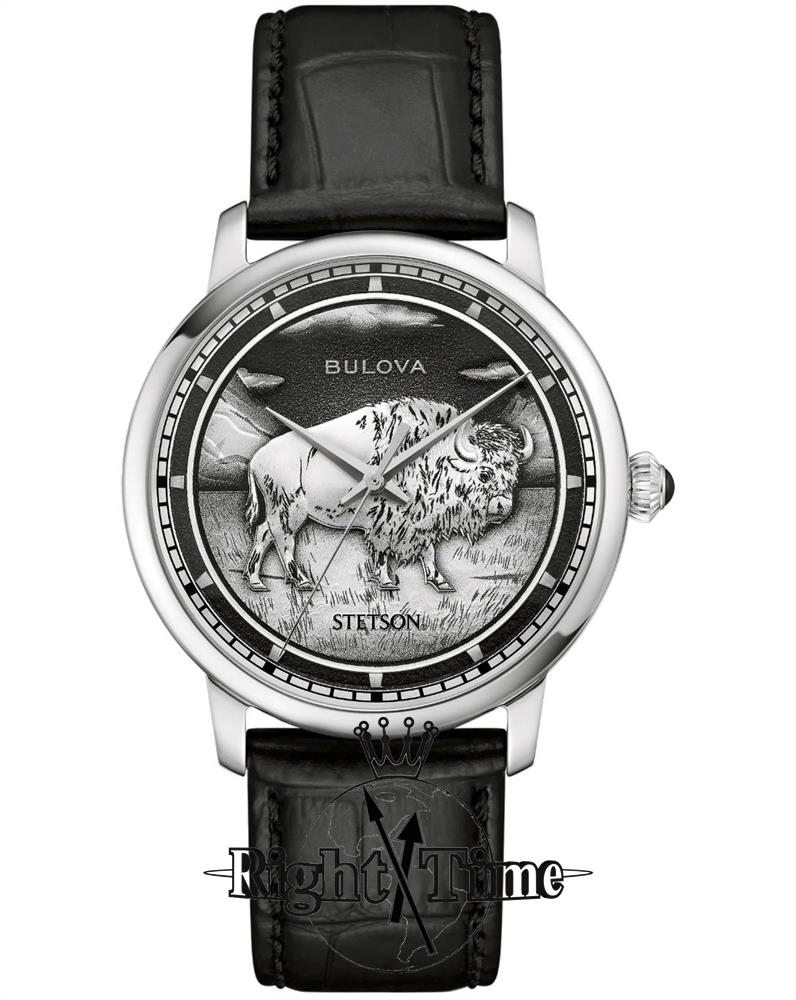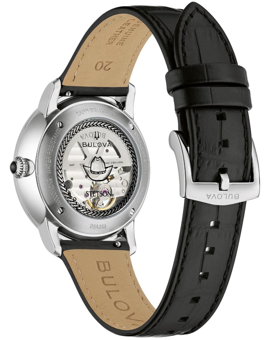 Bulova Stetson Bison watch. Model 96A333. Automatic movement. Stainless steel case with black leather band. Black dial with a stamped American Bison medallion on the dial symbolizes the enduring spirit of the West echoing Stetson`s legendary style and attention to detail