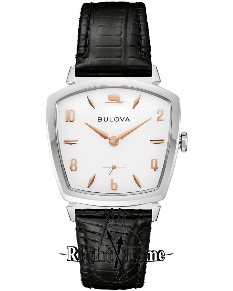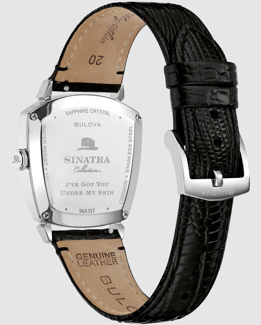 Bulova "I`ve Got You Under My Skin" collection commemorating legendary performer Frank Sinatra. Model 96A337 features a polished inverted trapezoidal stainless steel case. The scratch resistant sapphire crystal covers white dial with polished rose gold tone hands and markers. Worn on black Teju lizard grain strap.