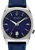 Bulova Accutron II Surveyor model 96B212 powered by Bulova quartz Precisionist movement. Stainless steel case with blue leather band. Blue dial with date calendar, luminous hands and markers.