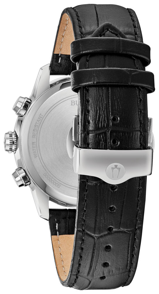 Bulova Sutton chronograph watch model 96B310. Quartz movement. Stainless steel case with black leather band. Deep forest green color dial with "Big" date calendar.