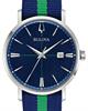 Bulova Classic Aerojet watch model 96B316. Quartz movement. Stainless steel case with blue and green striped NATO style nylon band. Blue color dial with large markers and date calendar.