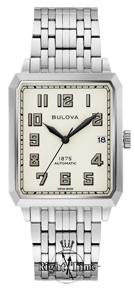 Bulova Limited Edition from the "Joseph Bulova" collection. A homage to the brands founder, this retro style timepiece features a steel case, Swiss-made automatic movement, and beige Arabic dial. The case-back has partial observation crystal and is engraved with Joseph Bulova`s signature, and the limited edition number of 350 pieces. Comes on a steel bracelet with spring-loaded deployment buckle. Sapphire crystal.