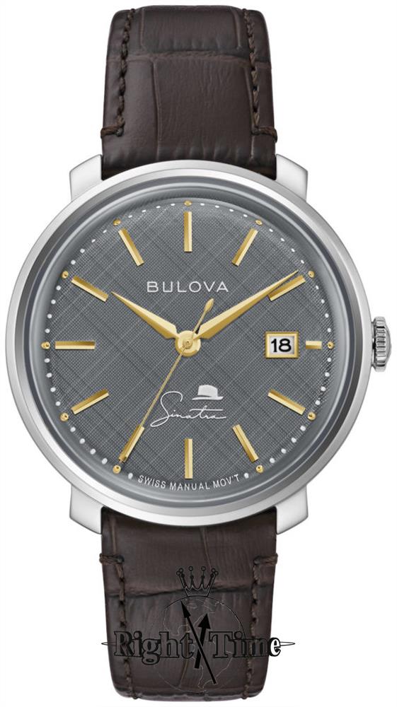 Bulova Frank Sinatra "The Best is Yet to Come" Collection. Model 96B345. Powered by Sellita SW215 manual wind movement. Stainless steel case with leather band, grey textured brushed dial, open case back.