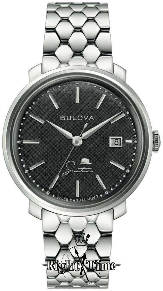 Bulova Frank Sinatra "The Best is Yet to Come" Collection. Model 96B346. Powered by Sellita SW215 manual wind movement. Stainless steel case with bracelet, grey textured brushed dial, open case back.