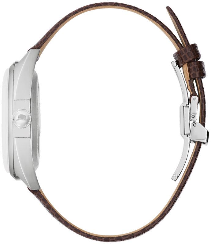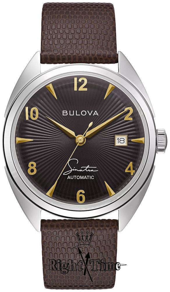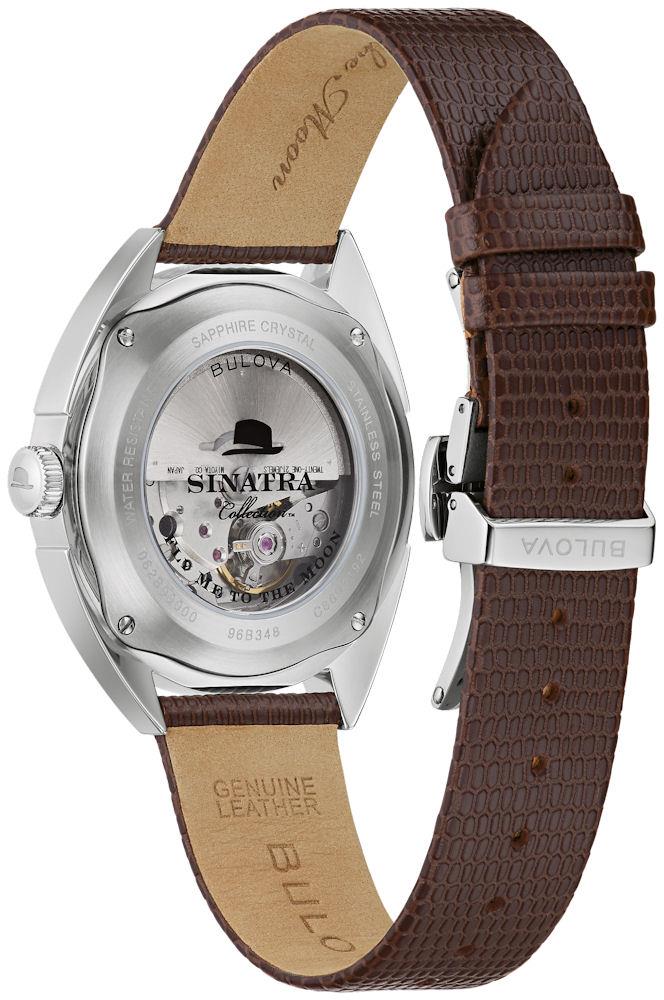 Bulova Frank Sinatra "Fly Me To The Moon" Collection. Model 96B348. Powered by Miyota 8215 automatic movement. Stainless steel case with leather band, black tone textured dial, open case back.