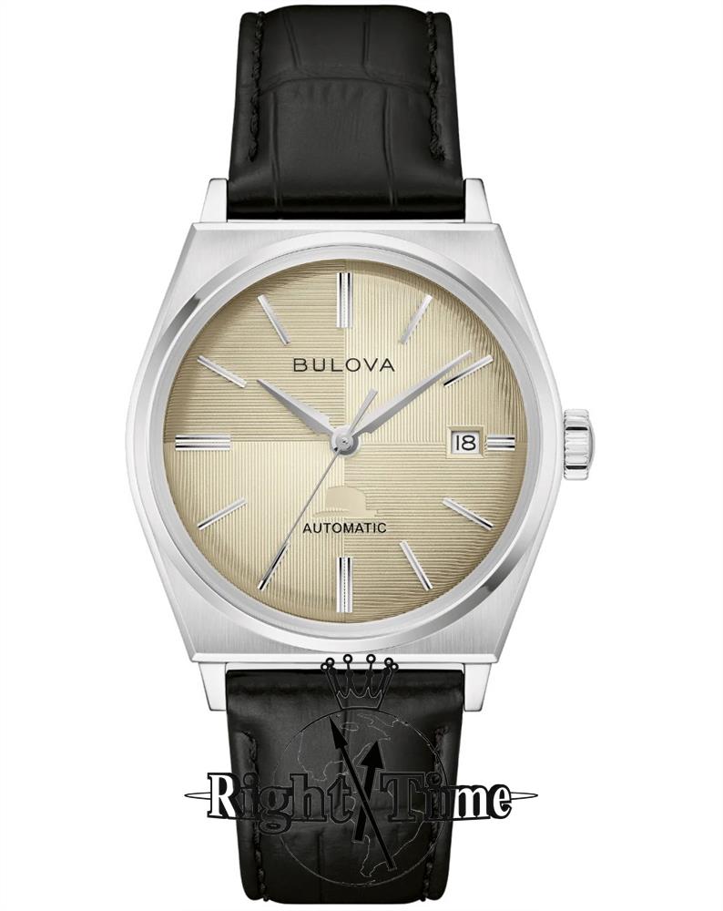 Bulova Frank Sinatra "Nothing But The Best" Model 96B483. Powered by automatic movement. Stainless steel case with black alligator textured leather band, beige color dial, open case back.