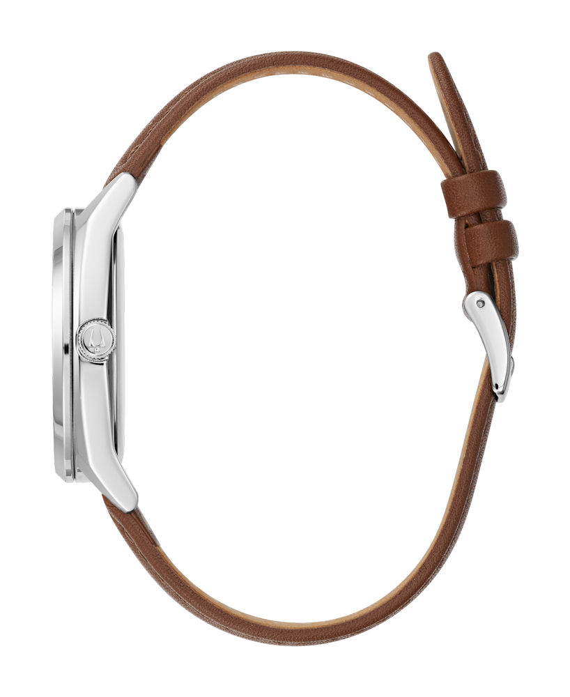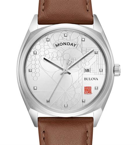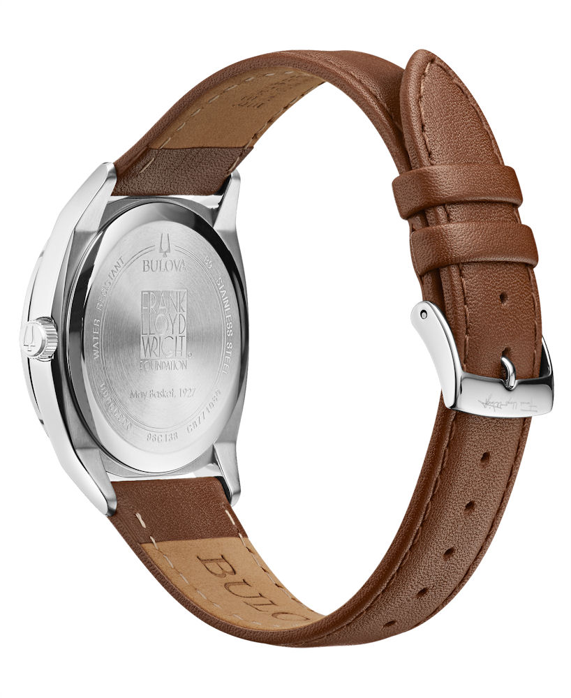 Bulova Frank Lloyd Wright Men`s Watch. Model 96C138 May Basket. Design is based on Wright`s drawing for Liberty magazine in 1927. The watch features a detail from an abstraction of a basket of overflowing grapes and other fruit in springtime. Quartz movement. Stainless steel case with brown leather strap.