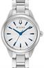 Bulova Sutton watch. Model 96L285. Quartz movement. Stainless steel case with bracelet. Silver tone dial with blue markers