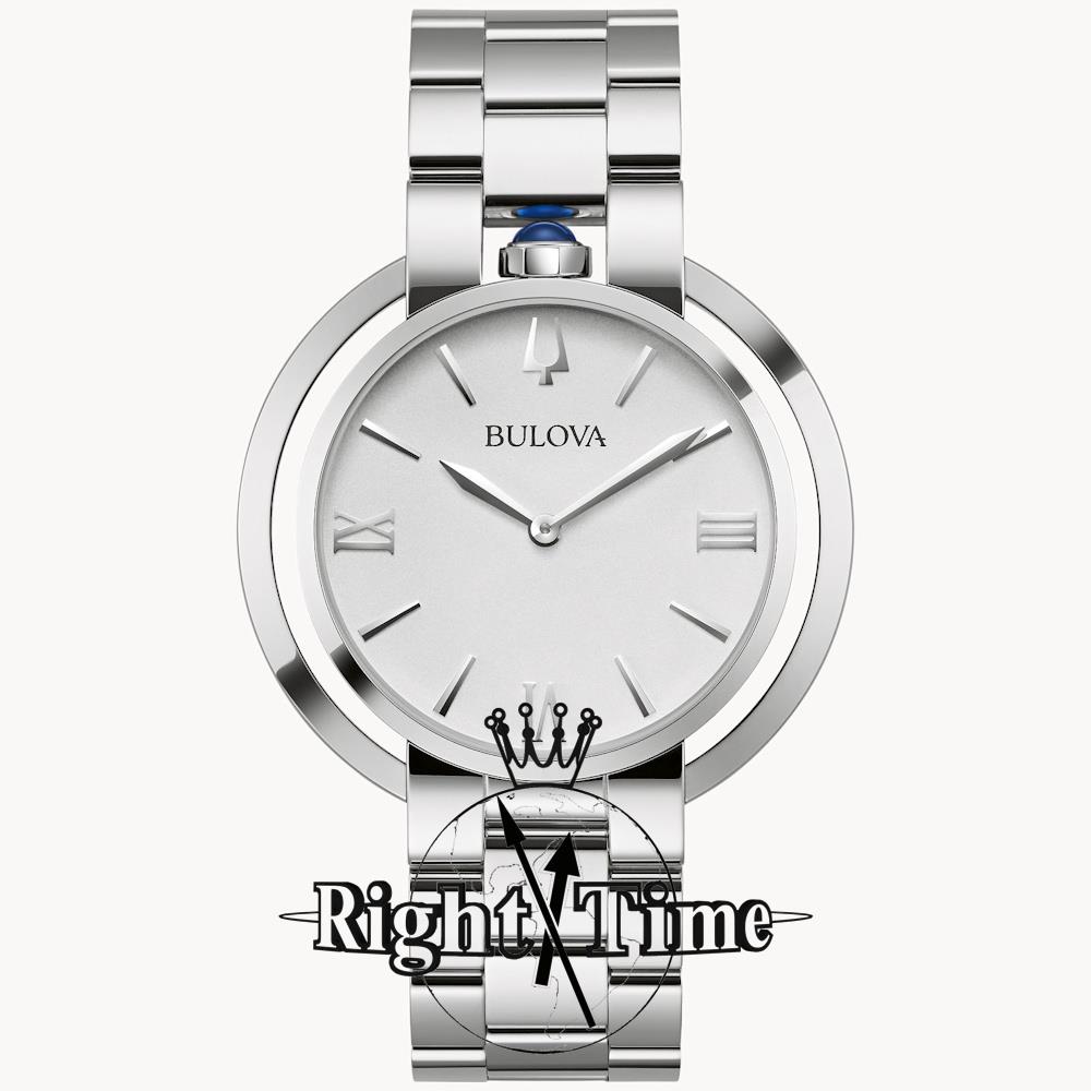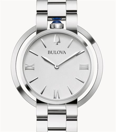 Bulova Rubaiyat Collection. Watch model 96L306. Quartz movement. Stainless steel case with synthetic blue spinel cabochon crown at 12 o`clock position. White dial with steel Roman markers. Steel bracelet.
