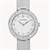 Bulova Crystal watch. Model 96L329. Quartz movement. Slim stainless steel case with bracelet and crystal bezel. Silver tone dial with crystal markers