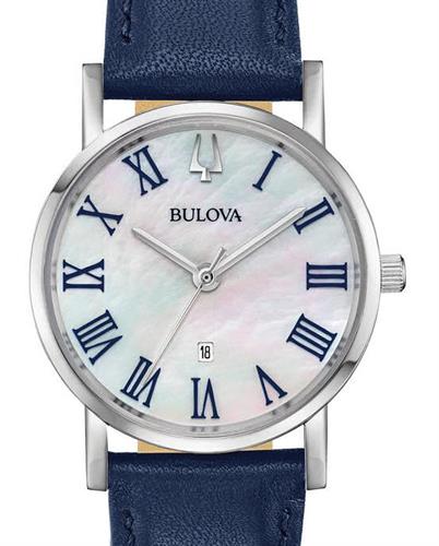 Bulova Classic watch. Model 96M146. Quartz movement. Stainless steel 32mm case with blue leather strap. White Mother-of-Pearl dial with large blue Roman numerals and date calendar.