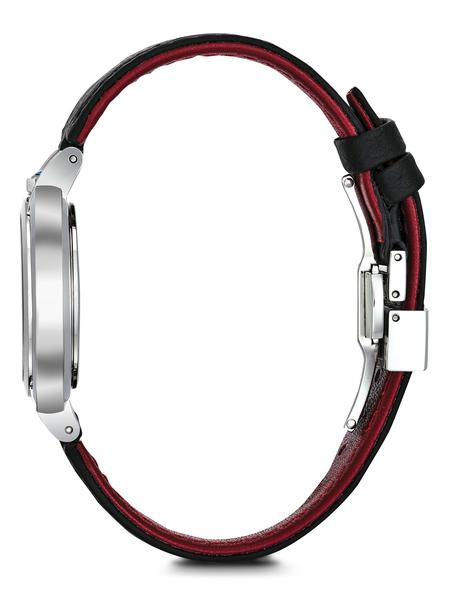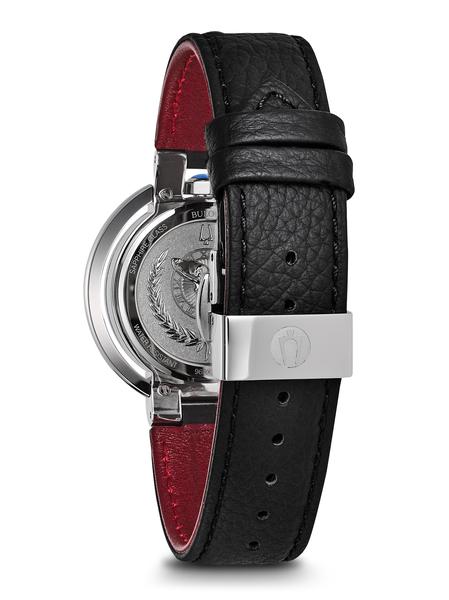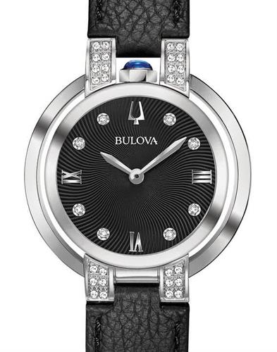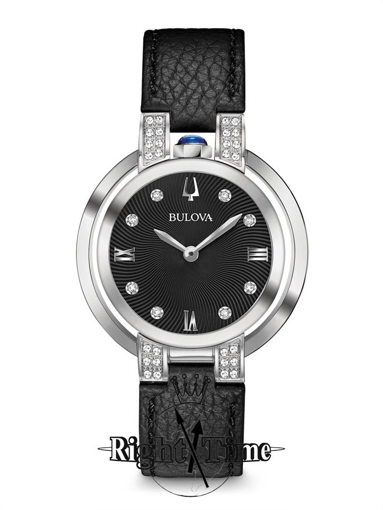 Bulova Rubaiyat Collection. Watch model 96R217. Quartz movement. Stainless steel case with synthetic blue spinel cabochon crown at 12 o’clock position and diamonds on the lugs. Black color textured dial with diamond markers. Black leather band. Iconic dye struck "Goddess of Time" dimensional case back