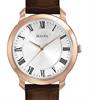 Bulova Classic watch. Model 97A107. Quartz movement. Rose gold plated stainless steel case. Silver color dial with Roman numerals. Brown leather band