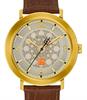 Bulova Frank Lloyd Wright Men`s Watch. Adaption from the dome design of the SC Johnson Administrative Building. Model 97A117. Quartz movement. Stainless steel gold plated case with brown leather strap.