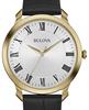 Bulova Classic watch. Model 97A123. Quartz movement. Yellow gold plated stainless steel case. Silver color dial with Roman numerals. Black leather band