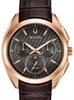 Bulova Men`s Curv chronograph watch. Model 97A124. High Performance Quartz Curv Chronograph movement. Rose gold plated stainless steel case with brown leather strap. Curved sapphire crystal. Black dial with rose gold tone hands and markers.