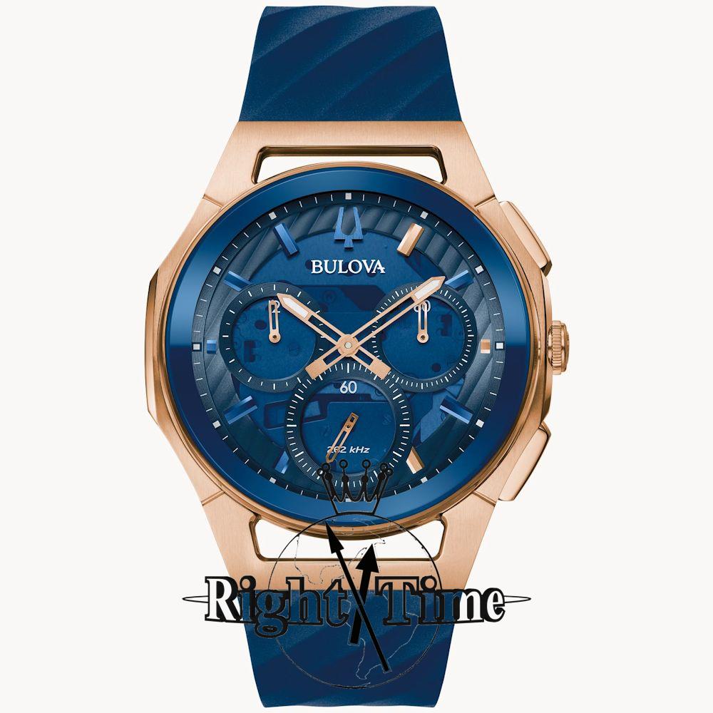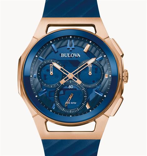 Bulova Men`s Curv chronograph watch. Model 97A185. High Performance Quartz Curv Chronograph movement. Rose gold plated stainless steel case with blue rubber band. Curved sapphire crystal. Blue dial