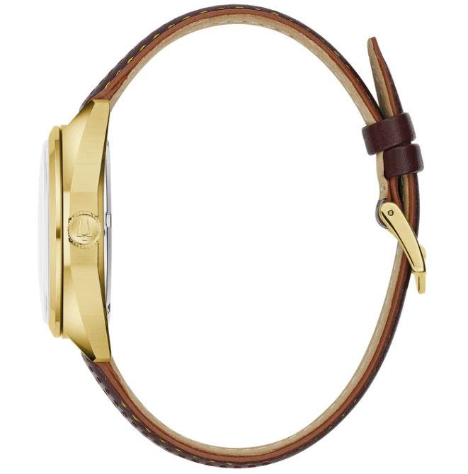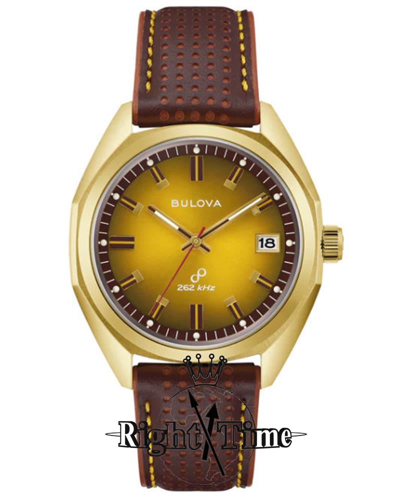 Bulova Jet Star model 97B214. Bulova precisionist quartz movement. Yellow gold plated solid stainless steel case. Brown leather strap with yellow stitch. Domed sapphire crystal. Butterscotch dial with brown accents. Water resistant to 50 meters.