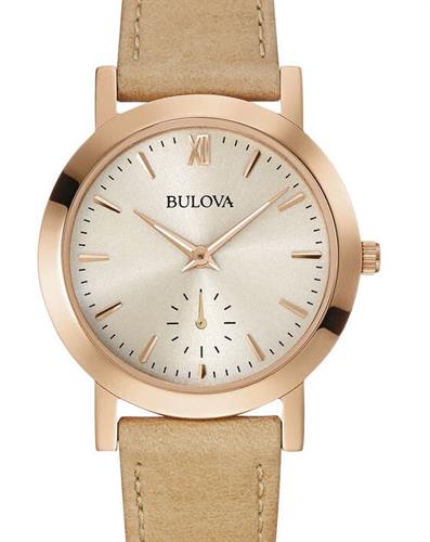 Bulova Classic watch. Model 97L146. Quartz movement. Rose gold plated stainless steel case. Grey sunray color dial with small seconds sub-dial. Sand color leather band