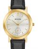 Bulova Classic watch. Model 97L159. Quartz movement. Yellow gold plated stainless steel case. White color dial with small seconds sub-dial. Black color leather band