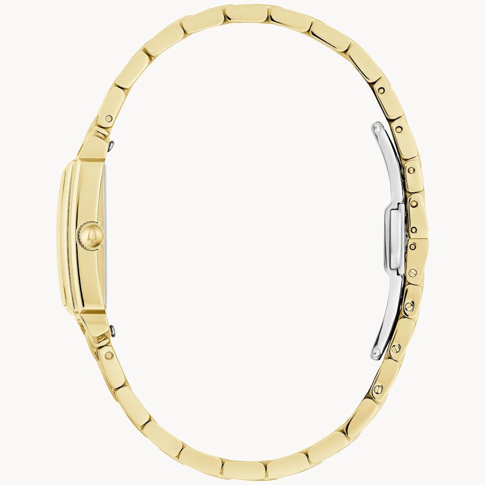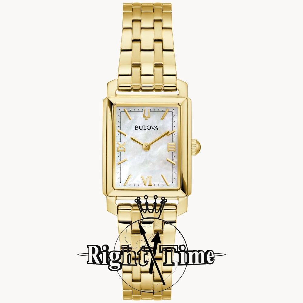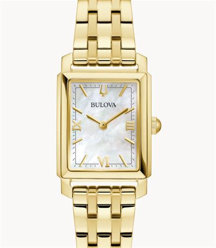 Bulova Sutton watch. Model 97L177. Quartz movement. Gold plated stainless steel rectangular case with bracelet. White Mother-of-Pearl dial.